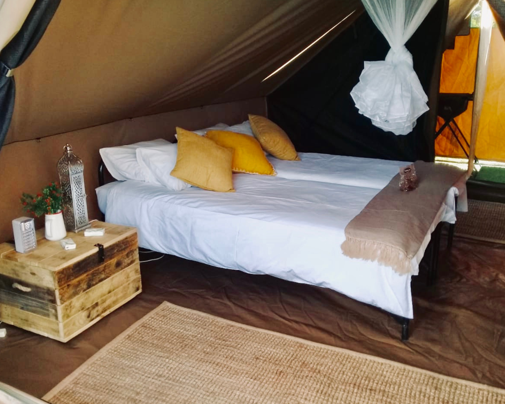 Each tent is thoughtfully equipped with elegant interiors featuring comfortable beds and high-quality bedding, ensuring a restful and enjoyable experience for your guests.